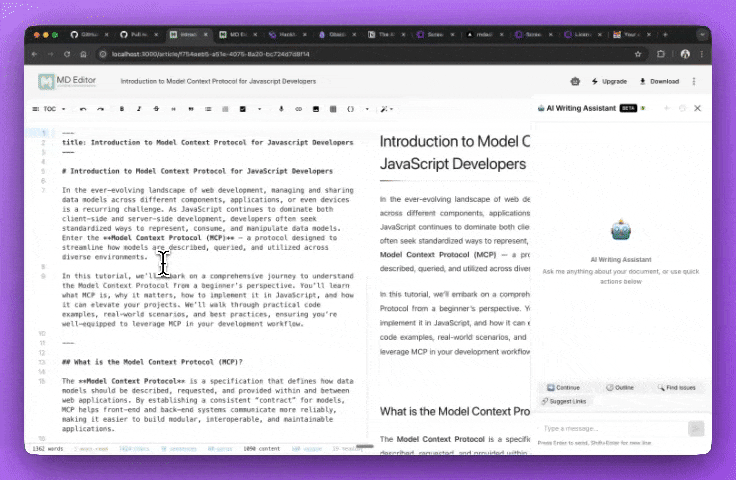 Discover how AI-powered features in MD Editor can supercharge your technical writing workflow. Learn about AI-assisted content generation, code snippet creation, and smart writing tools for developers and tech writers.